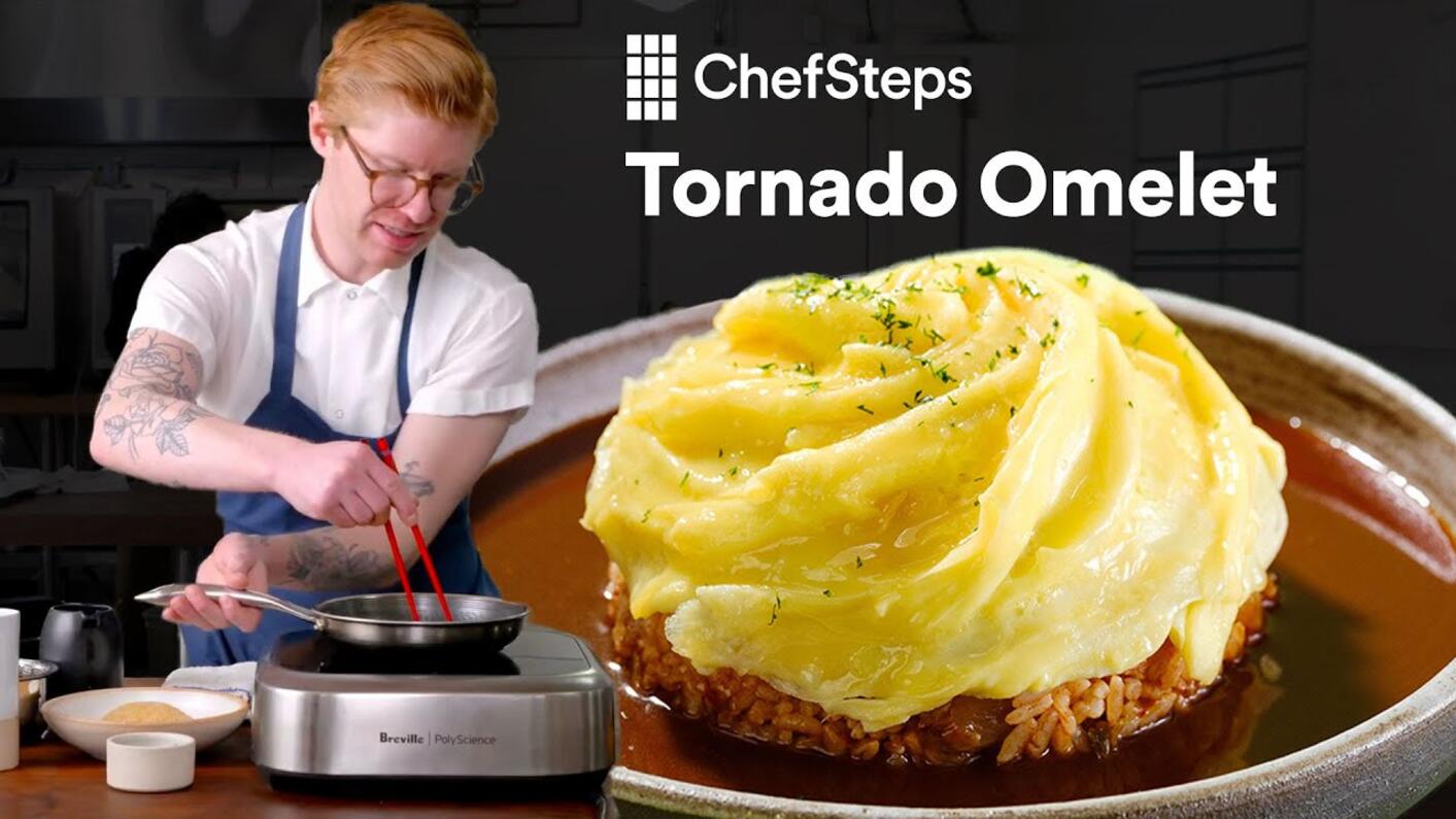 Al igual que su prima francesa, la tortilla tornado se hace con huevos, sal y agua (aunque puedes usar caldo o demi glace). En este vídeo se le añade almidón de maíz, que le aporta una textura sedosa a la vez que ayuda a mantener que la tortilla no se deshaga mientras la haces girar. Necesitarás algo de grasa y para ello puedes utilizar aceite vegetal o de oliva, pero la mantequilla clarificada funciona muy bien.