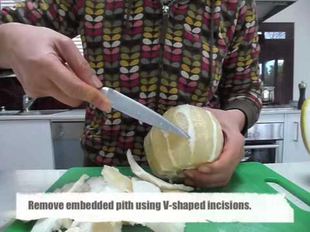 Lo mas engorroso del pomelo es que tiene una piel bastante dura, que se puede retirar clavándole un cuchillo y pelándolo como si fuese un plátano. Una vez pelado, sólo queda quitar la parte blanca (que tiene un sabor amargo, como en los demás cítricos) con un cuchillo y partir el pomelo en partes iguales, como se muestra en este vídeo de FeastingInTheKnow.