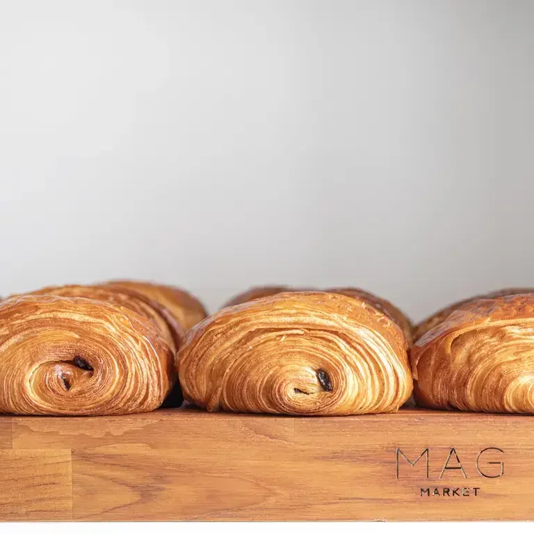 Aunque procuro resistirme a la tentación de probar mis propios croissants y pains au chocolat en las mañanas en que me dedico a la pastelería de Mag Market, no siempre lo consigo. En Mag, incluso la viennoiserie se hace con levain y fermenta sin prisas. El resultado es un hojaldre precioso, capaz de combinar crocancia y suavidad.