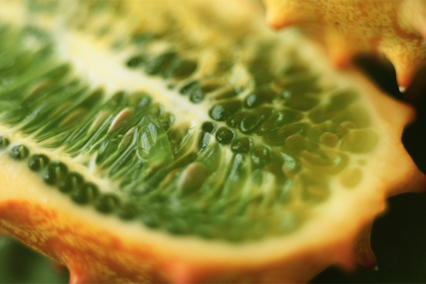 Conocido también como pepino cornudo africano y melón africano, el kiwano es el fruto de una planta originaria de África: la Cucumis metuliferus , de la familia de las Cucurbitaceae (la misma de la sandía y del melón). Se trata de una planta trepadora cuyo fruto se ve cada vez más entre las frutas exóticas que se consumen en los mercados occidentales.