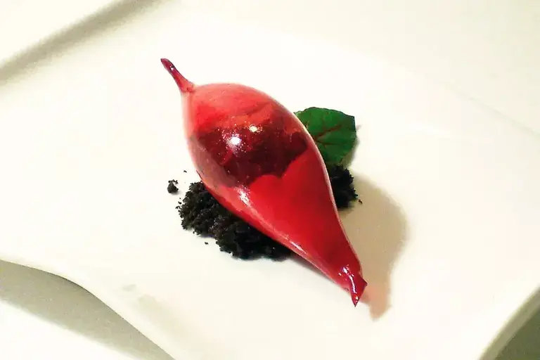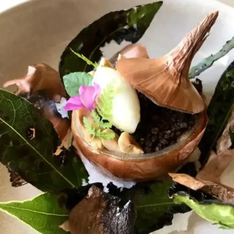 Cebolla rellena con crumble de cacao y mousse de Parmigiano Reggiano