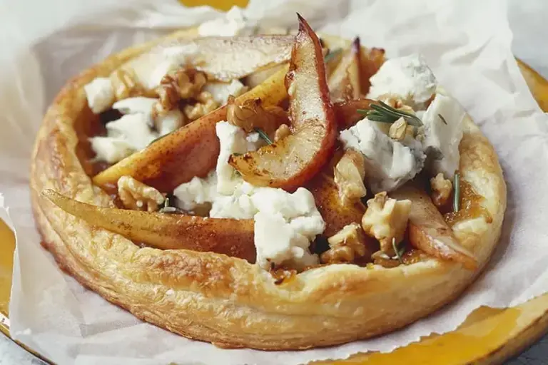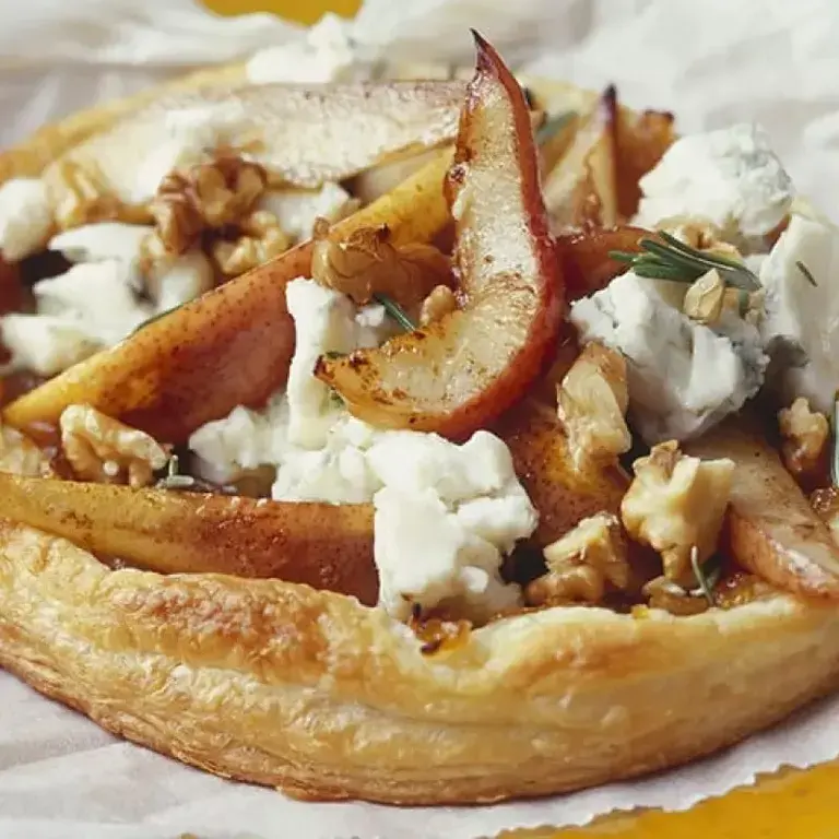 Saborea un reconfortante brunch perfecto para toda la familia. Disfruta de la sencillez de una tarta de pera adornada con cebollas caramelizadas y cremoso queso Gorgonzola. Este plato fácil de preparar promete una armoniosa mezcla de sabores dulces y salados, dando lugar a una experiencia culinaria mágica.