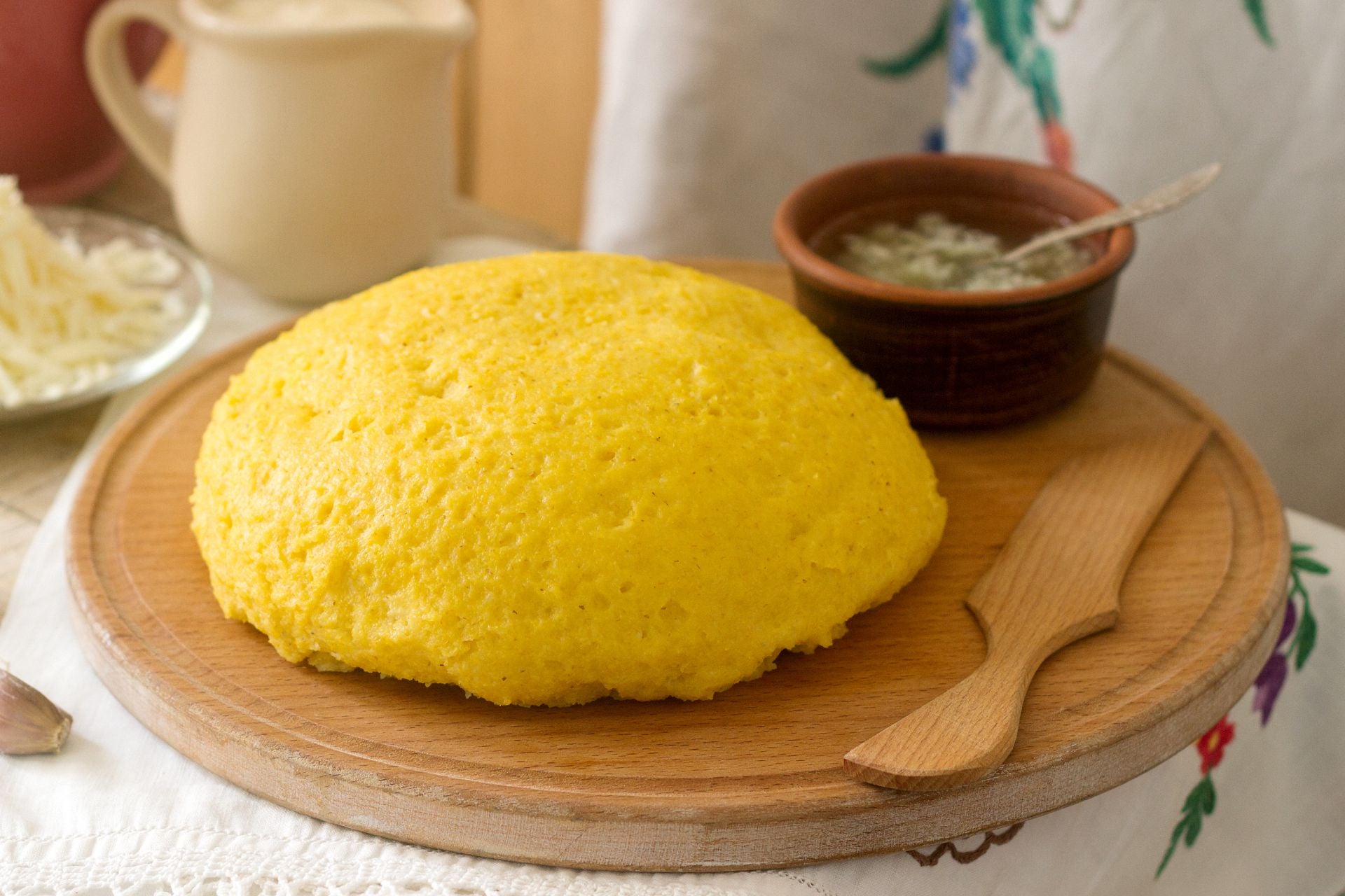 300 g de harina de maíz, 500 cl de agua, 150 g de mantequilla, 50 g de queso rallado, 1 cebolla, 5 lonjas de panceta ahumada, 2 cucharadas de aceite de oliva, sal y pimienta al gusto