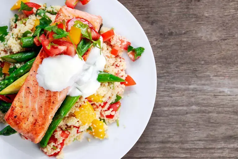 Este plato no podría ser más sencillo y delicioso. Dora los lomos de salmón a la plancha con un poco de aceite de oliva durante 3 minutos por cada lado. Mientras tanto, prepara una salsa mezclando yogur natural con eneldo fresco picado, el zumo de medio limón, una pizca de sal y pimienta. Sirve el salmón cubierto con esta salsa refrescante. Si quieres obtener una textura más cremosa, puedes utilizar yogur griego en lugar de natural.