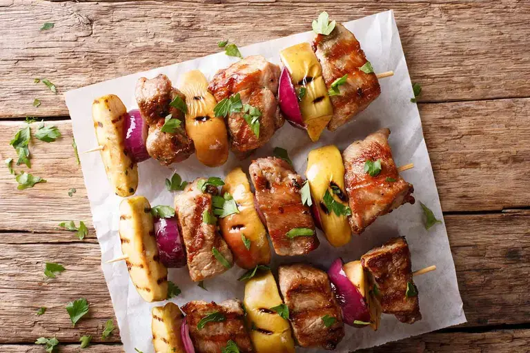 Esta receta funciona muy bien como aperitivo o entrante (en porciones pequeñas) o bien como plato principal. Para preparar las brochetas, deberás primero dejar marinar aproximadamente una hora el solomillo en cubos en una mezcla de salsa de soja, miel, ajo y aceite. Puedes experimentar con sabores mediterráneos, haciendo una mezcla de limón, ajo y hierbas frescas, o bien con sabores asiáticos, agregando jengibre rallado y unas gotas de aceite de sésamo. O también con algunas opciones más osadas: mostaza antigua y miel para un sabor agridulce o yogur, cúrcuma y comino si prefieres un toque especiado al estilo hindú. La carne también puede dejarse marinando toda la noche en la nevera para que el sabor resulte más intenso. Ensarta los trozos de carne alternándolos con trozos de pimiento verde y rojo y cebolla morada en los palillos. También puedes variar las verduras: prueba con champiñones, calabacín o incluso trozos de piña para un contraste dulce. Cocina las brochetas en una parrilla, en el horno con función grill o incluso en una sartén acanalada, asegurándote de pincelarlas con un poco de aceite para que no se sequen. Sirve acompañadas de hummus, tabulé o una vinagreta ligera para complementar los sabores, y también con ensalada fresca, arroz blanco o rodajas de pan de campo.