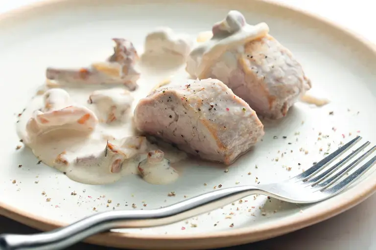 Solomillo de cerdo con salsa de trufa y puré de apionabo