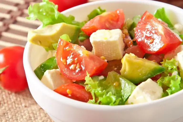Te proponemos otra ensalada sabrosa que tiene todo lo que tu cuerpo necesita en un solo plato y que es ideal para un almuerzo liviano. El huevo y el tofu aportan las proteínas, mientras que el tomate, además de un atractivo color, le da al plato una buena dosis de vitaminas y minerales. El aguacate, con su larga lista de propiedades, aporta grasas saludables y, junto con el tomate y el tofu, asegura la ración de vegetales recomendada.