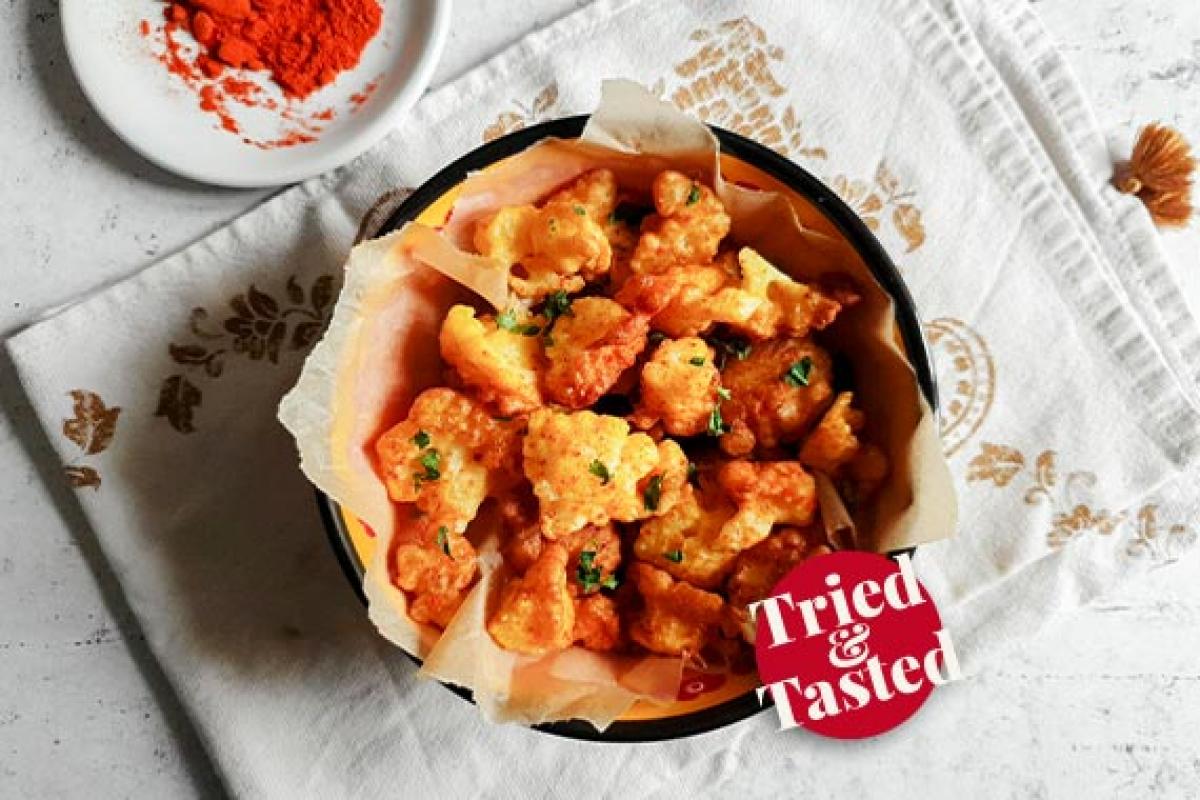 Tras bañar los ramilletes de coliflor en la masa, retira el exceso de masa en el borde del bol antes de freírlos en aceite vegetal hirviendo. Cuando estén crujientes y dorados, retíralos con un escurridor. Coloca los ramilletes fritos en una hoja de papel absorbente durante unos segundos antes de colocarlos en una bandeja decorada con hojas de cilantro toscamente picadas y una pizca de pimentón.