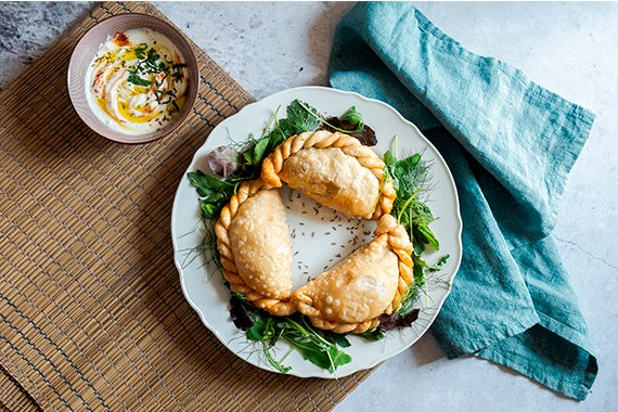 Saca las empanadas del horno y ponlas en una fuente, cúbrelas con hierbas frescas, condiméntalas con aceite de oliva y sírvelas con la salsa de yogur.