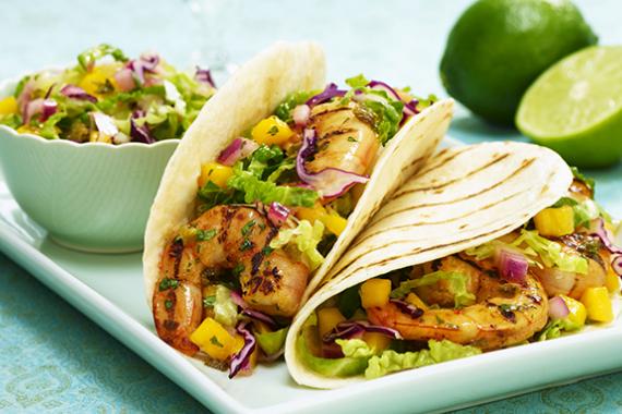 Estos tacos con langostinos a la plancha y salsa de mango, fáciles de preparar, son un plato principal picante y delicioso, pero también se pueden servir en un brunch.
