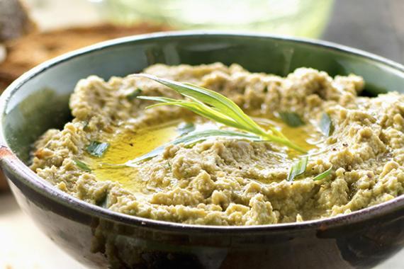 Vierte en un cuenco la Tapenade de aceitunas verdes, decora con estragón, aliña con lo que queda del aceite de oliva y... ¡ya está lista para servir!