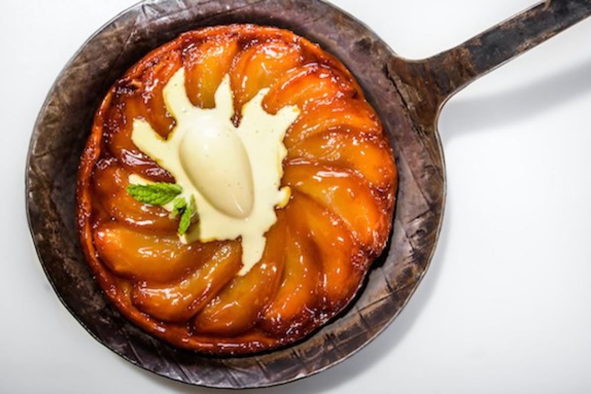 La receta de la fragante y deliciosa tarta Tatin de manzana del chef estrella Norbert Niederkofler, servida en una cacerola caliente con helado de vainilla.